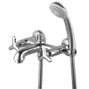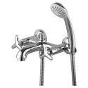 Назначение: ванна+душ • Конструкция: двухрычажный • Монтаж: вертикальный • Клапан: керамический • Материал: покрытие - хром • Подводка: жесткая • Монтажные отверстия: 2 отверстия • Форма излива: традиционная • Душевая лейка в комплекте: есть • Держатель для душевой лейки: на смесителе • Аэратор: есть • Эксцентрики в комплекте: есть • Донный клапан в комплекте: есть