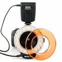 Тип: кольцевая • Ведущее число (ISO 100): 18 • Крепление: на объективе • Ручная регулировка мощности: есть • Эффективная дальность: 0.05 - 2 м • Цветовая температура: 5500K • Пилотный свет: есть • Батарея: 4 x AA • Дисплей: есть • Аксессуары вкомплекте: переходные кольца, цветной фильтр (лампа накаливания)