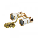 Театральный бинокль с витой цепочкой. Обладает 3-кратным увеличением и 25-миллиметровыми объективами. Корпус бинокля выполнен в элегантном дизайне черного цвета с золотистыми элементами.